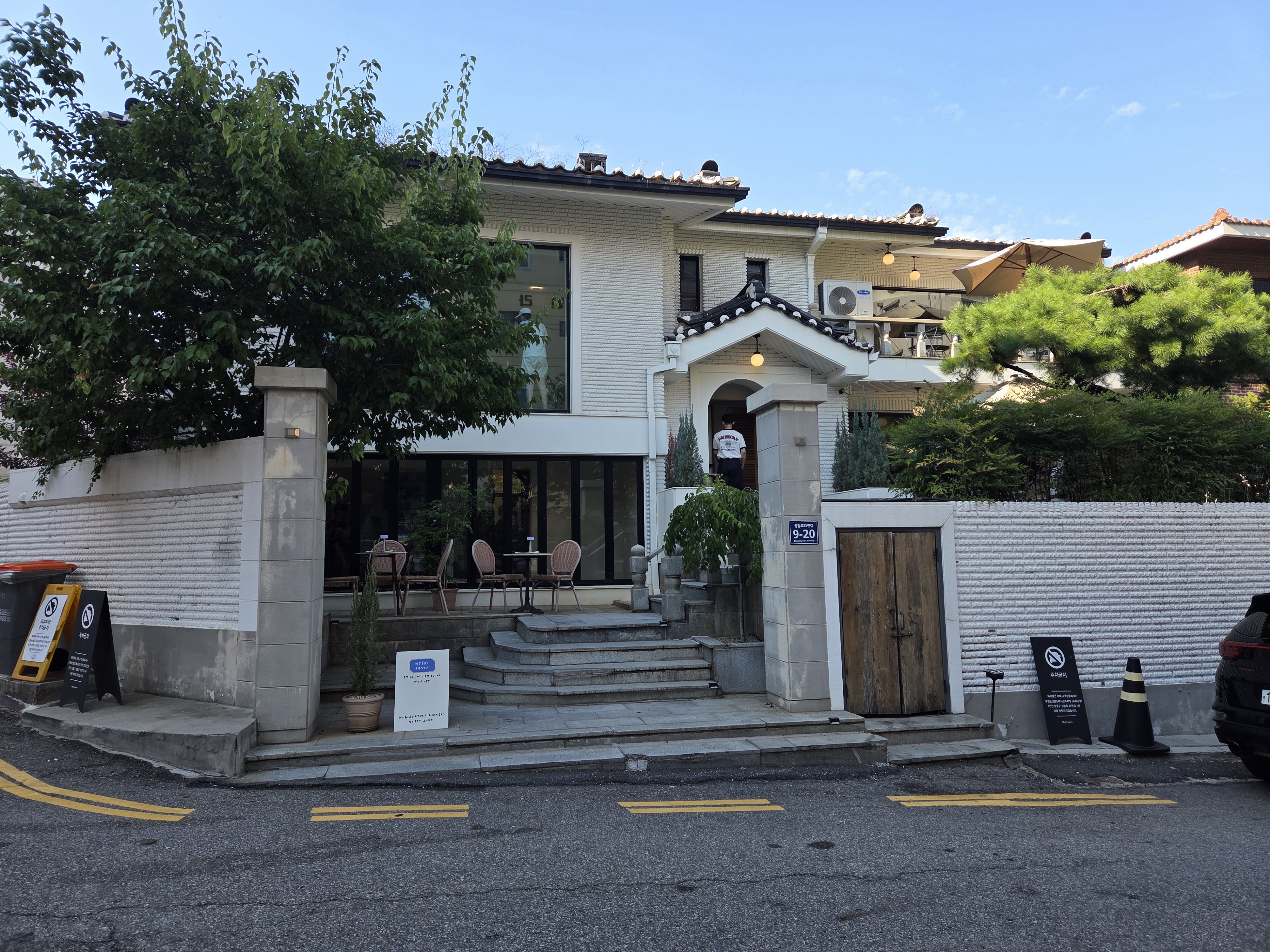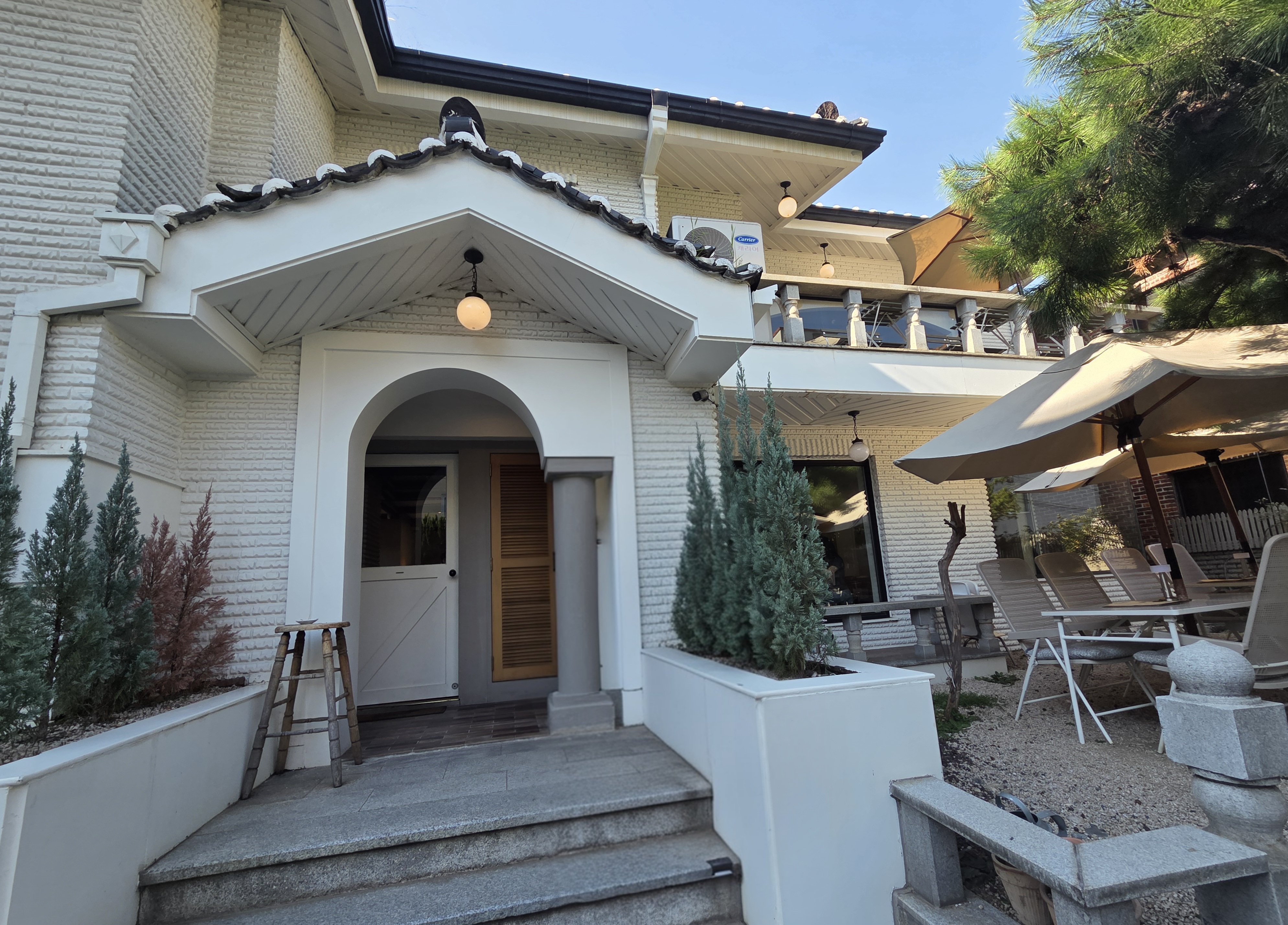 하얀 외벽 건물에 소나무가 멋스럽게 자리 잡고 있는 이곳!