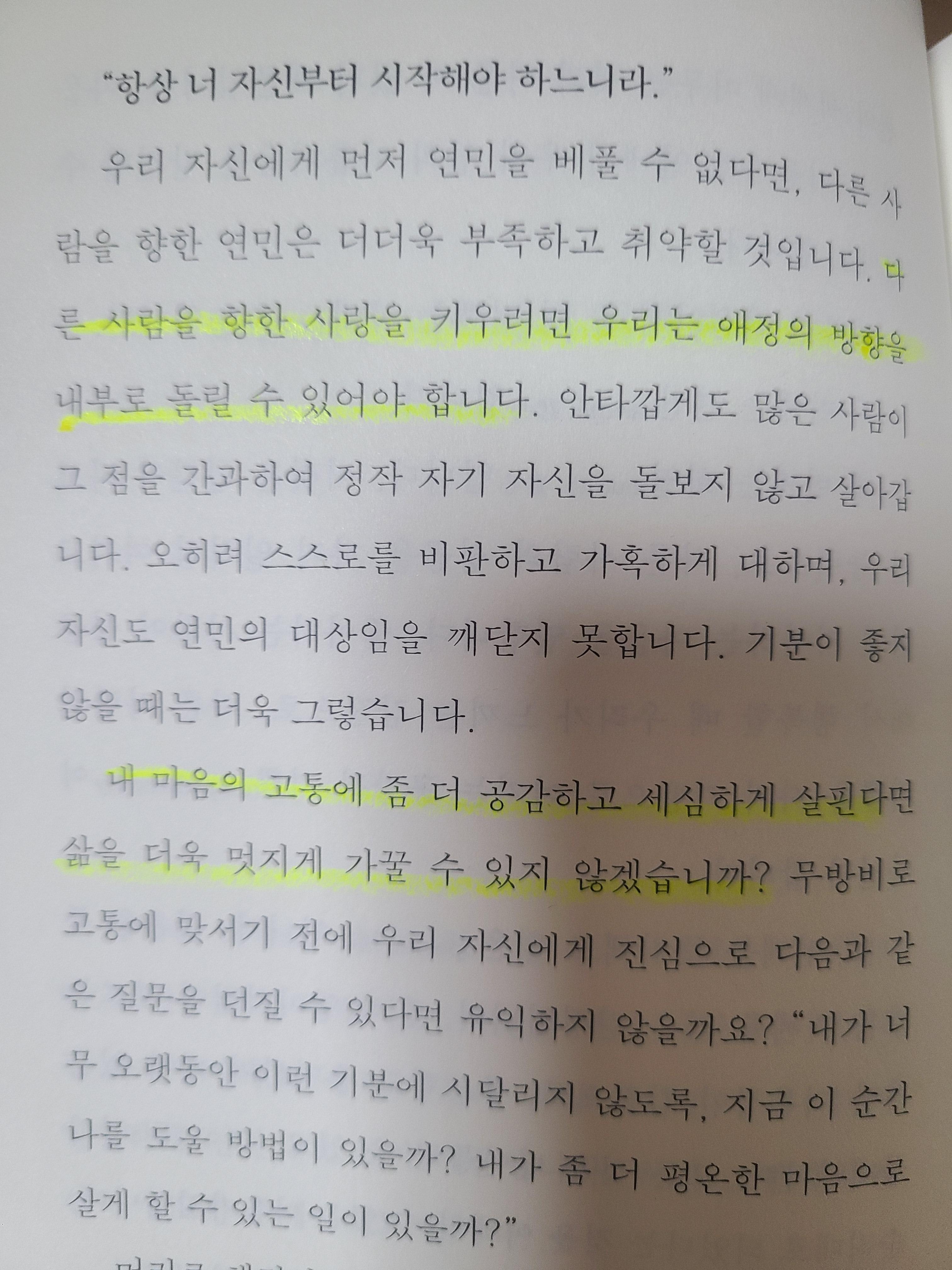 "다른 사람을 향한 사랑을 키우려면 애정의 방향을  내부로 돌릴수 있어야 합니다.