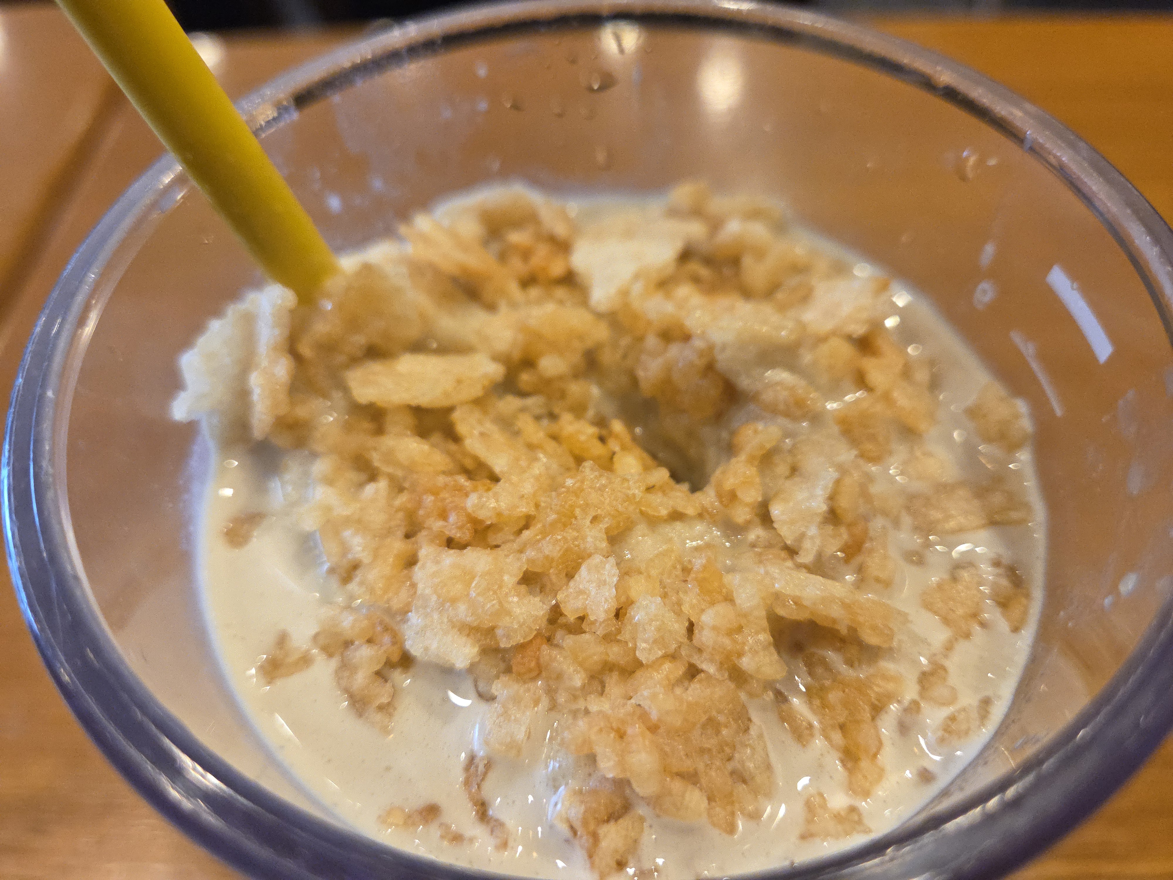 위에 바삭한 누룽지 토핑이 듬뿍 올라가 있어요.한입 마실 때마다 고소한 누룽지 향이 퍼지면서