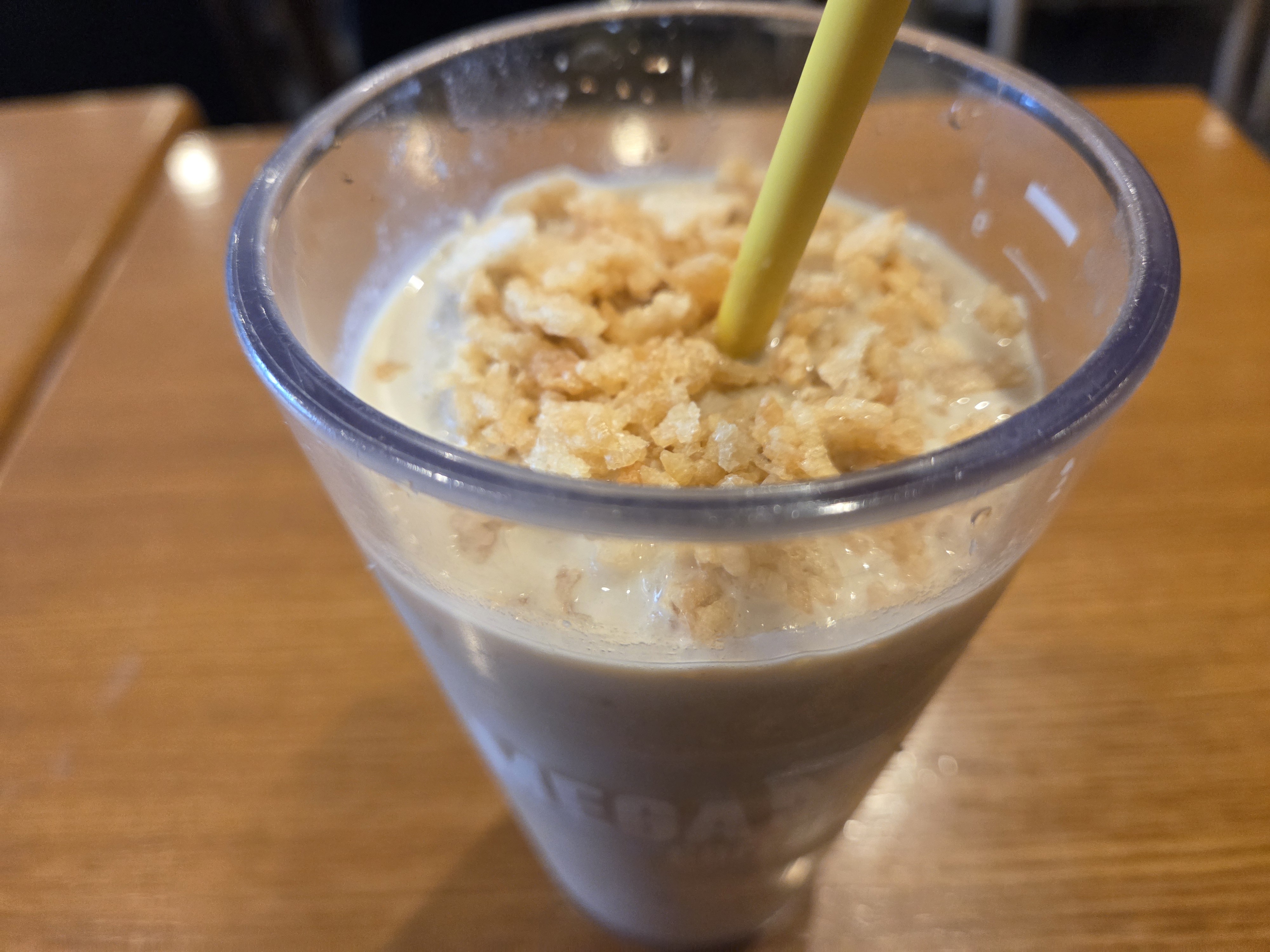 숟가락으로 떠먹는 재미도 있고,프라페를 섞어 마시면 누룽지가 살짝 불면서 바삭쫀득한 식감으로 변해요.