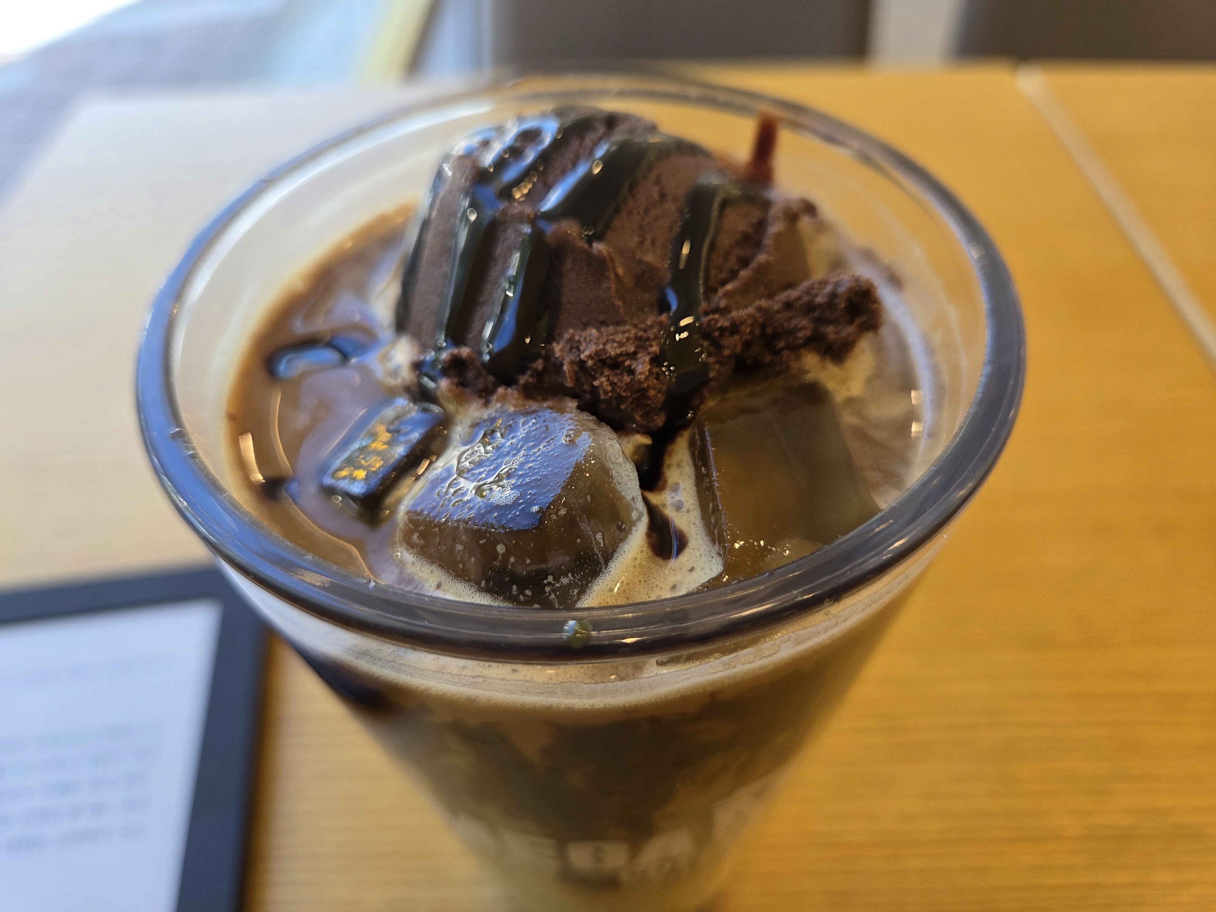 한 잔 안에 진한 초콜릿 아이스크림 + 쌉쌀한 말차 + 에스프레소가 들어가 있어서