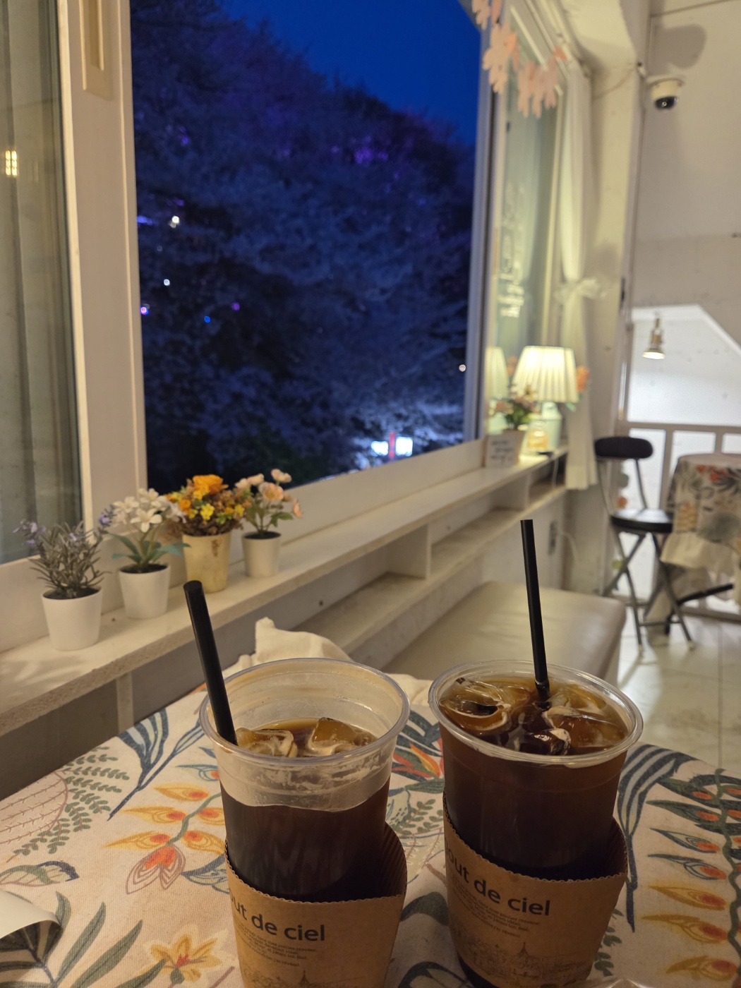 “벚꽃과 노을, 그리고 커피가 어우러진 로맨틱한 하루.”