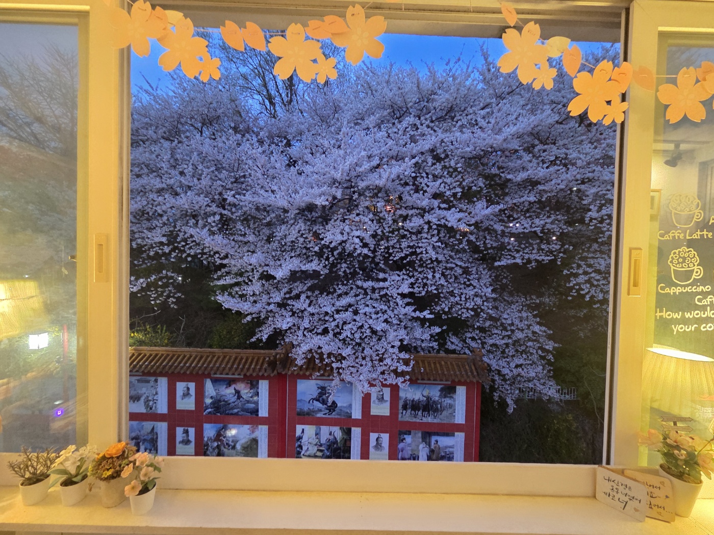 창밖엔 밤하늘과 벚꽃이 어우러지고,