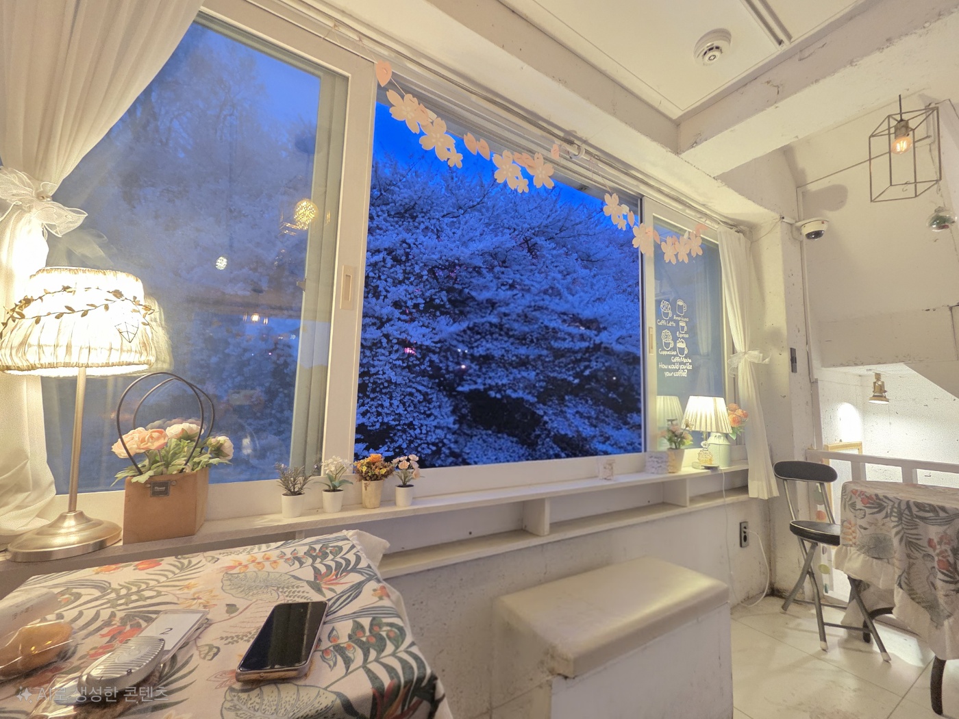 창밖엔 밤하늘과 벚꽃이 어우러지고,