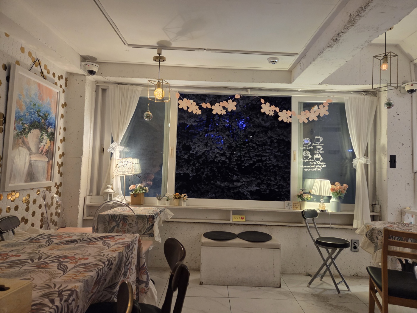 작은 화분들과 벚꽃 장식, 아늑한 조명까지…