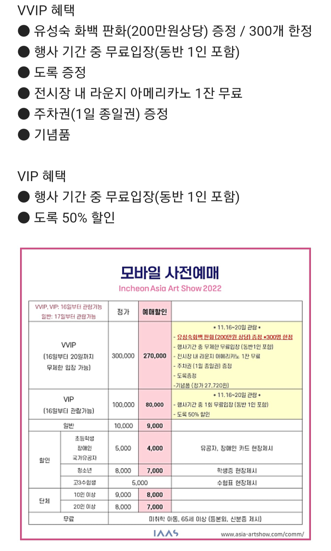 11월 16일부터 20일까지 인천 연수구 송도 컨벤시아에서 대규모 아트페어가 열립니다. 국내외 천여명의 미술작가들 작품 5000여점을 관람할수 있는 좋은 기회입니다. 16일 개막식을 시작으로 일반 관람은 17일부터입니다. 행사 첫날에는 작가와의 만남, 메타버스,NFT등 디지털 기술을 활용한 현대미술의 변화를 확인할 수 있는 다양한 이벤트도 마련된다고 하니 기대되네요.!