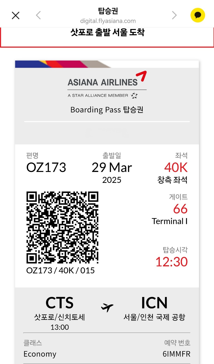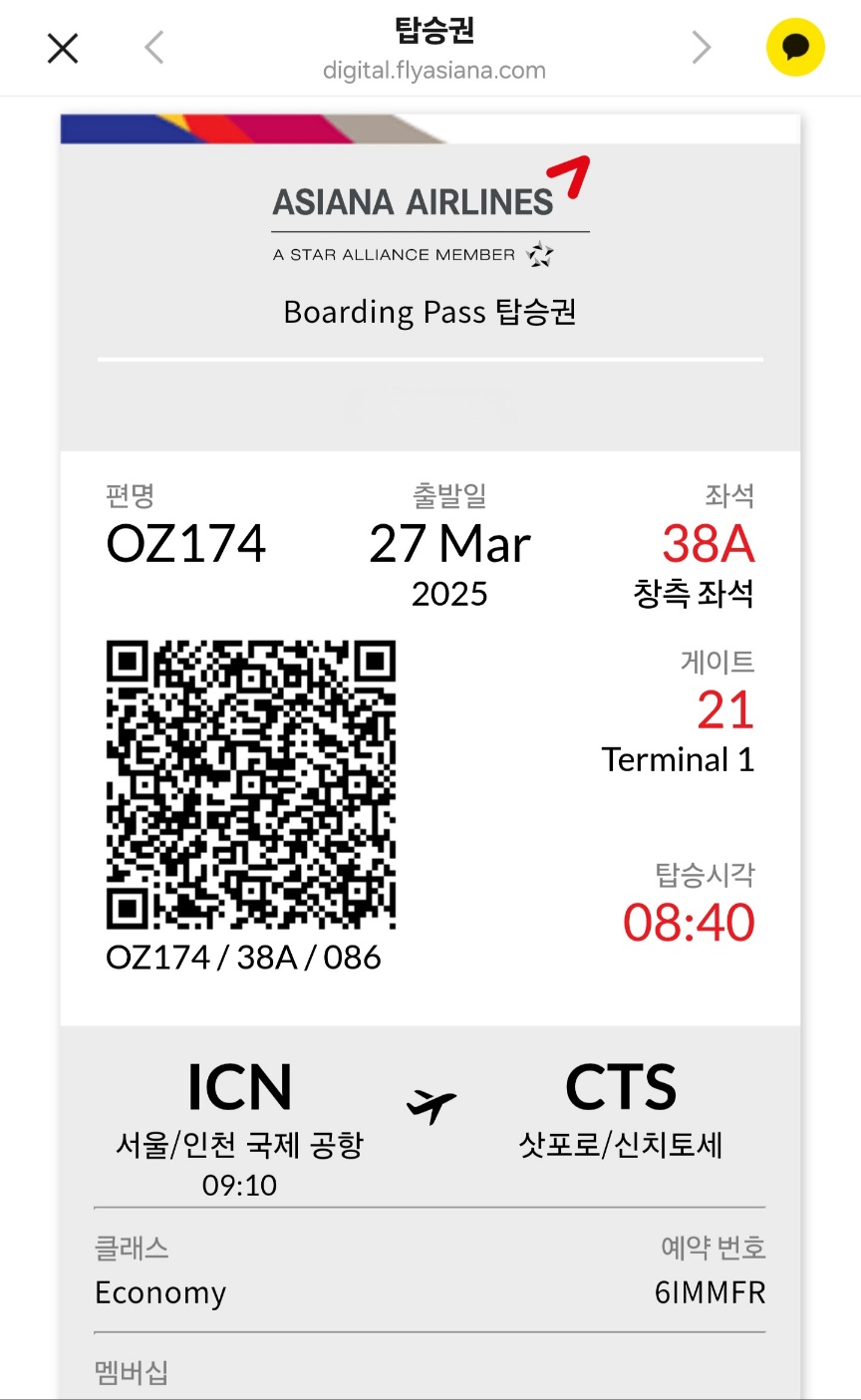 출국할땐 OZ174, 귀국할땐 OZ173편 이용, 갈때는 출국수속 하는데 1시간 정도 걸렸고 치토세 공항에서는 한 30분도 안걸린거 같다. 인천공항에 3시간 정도 전에 가야한다고 하는데 3월 말은 비수기여서 그런지 2시간 전에 가도 충분하다.