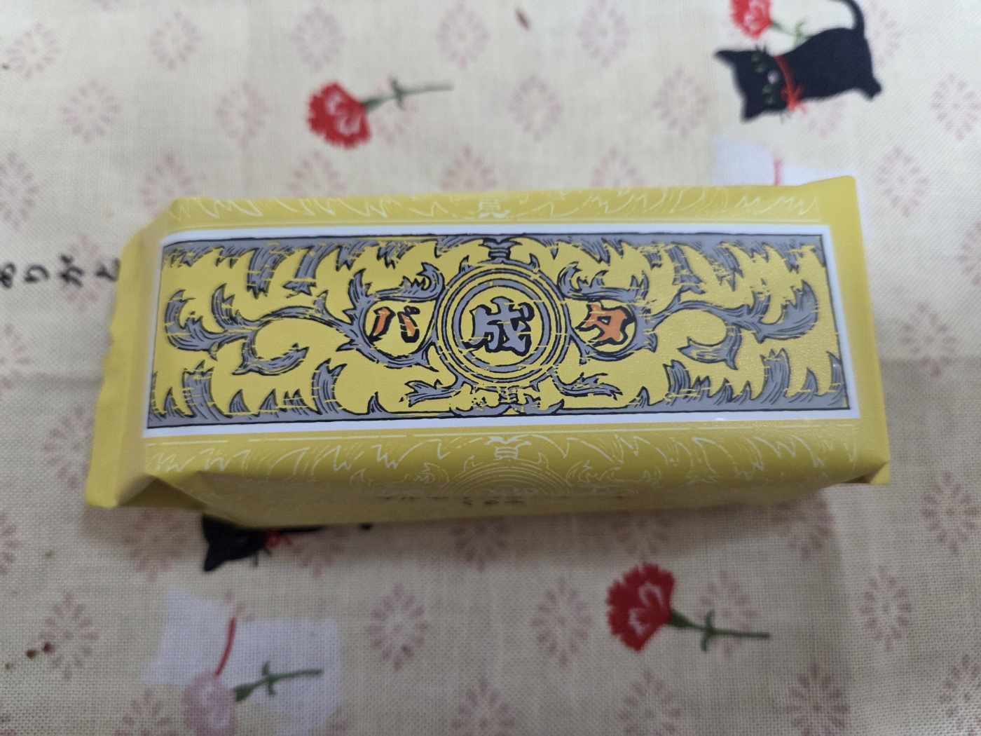 노란색 포장지에 전통적인 무늬와 마루세이 로고가 들어가 있는 이것은 마루세이 버터 케이크입니다~!