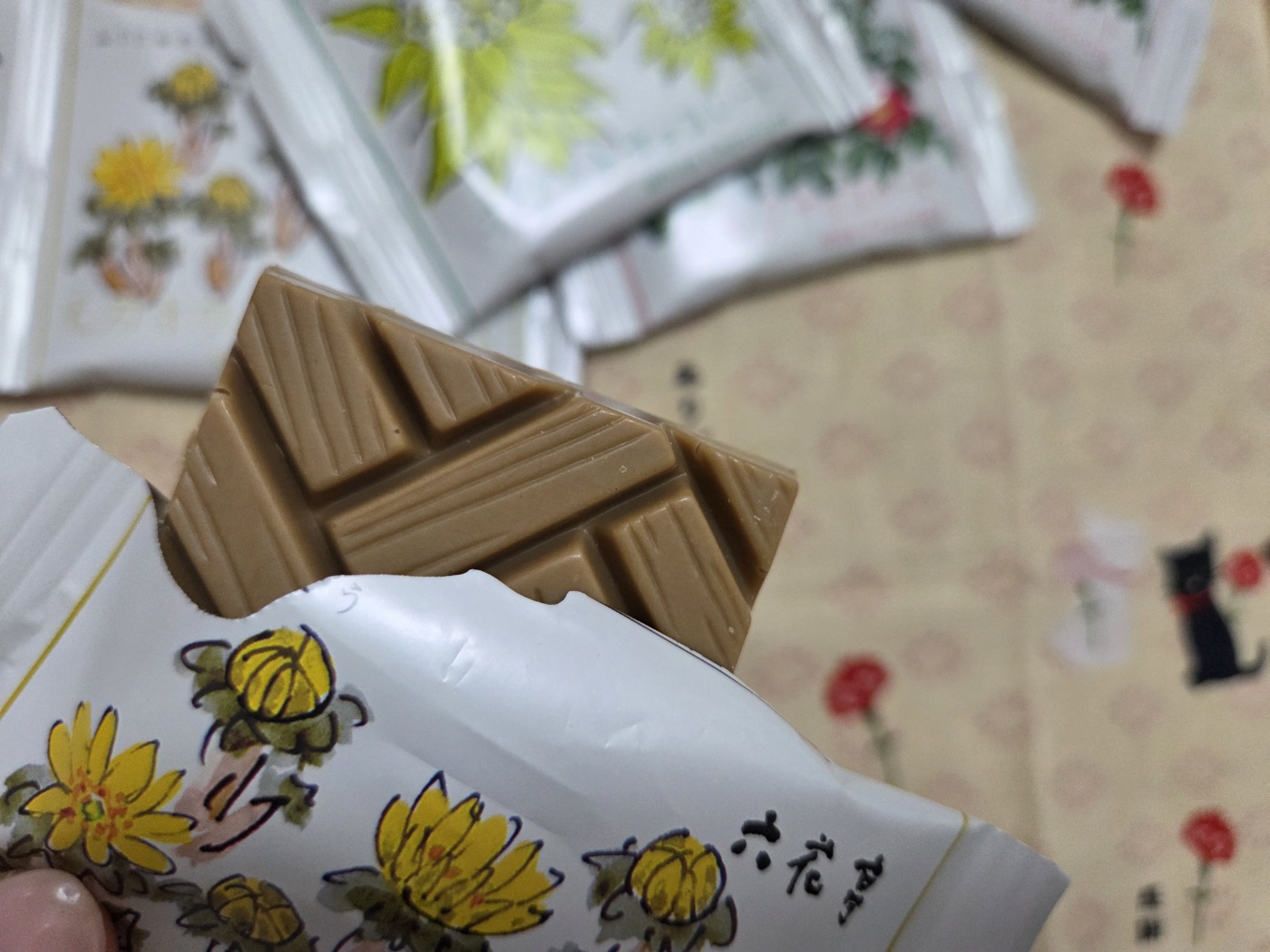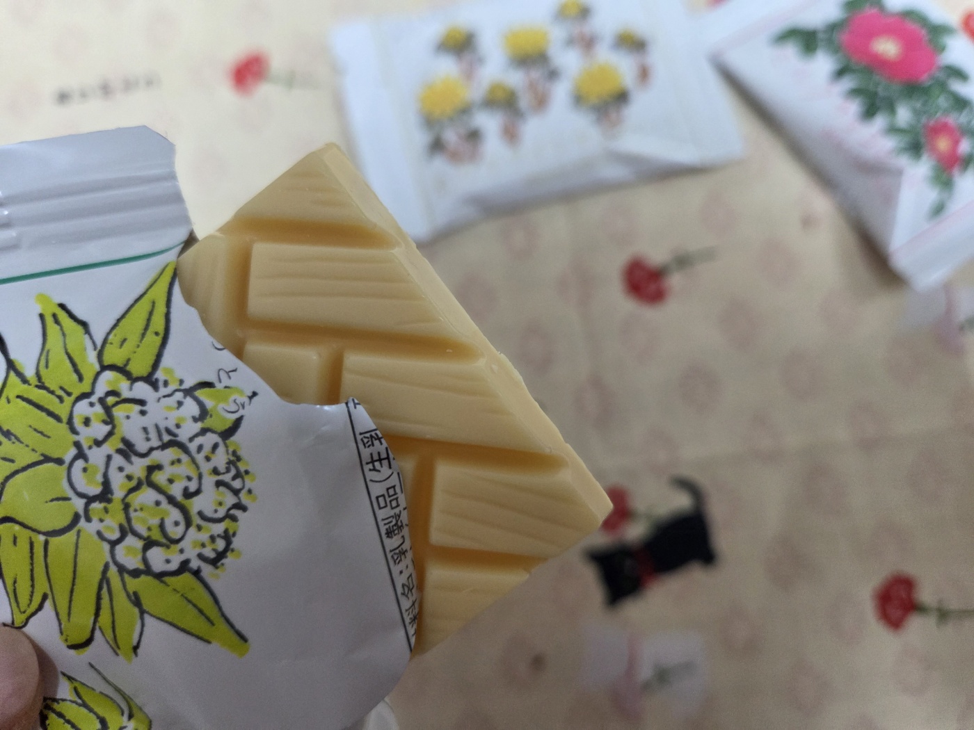 노란색 꽃이 그려진 이 초콜릿은 모카맛의 화이트초콜릿입니다.