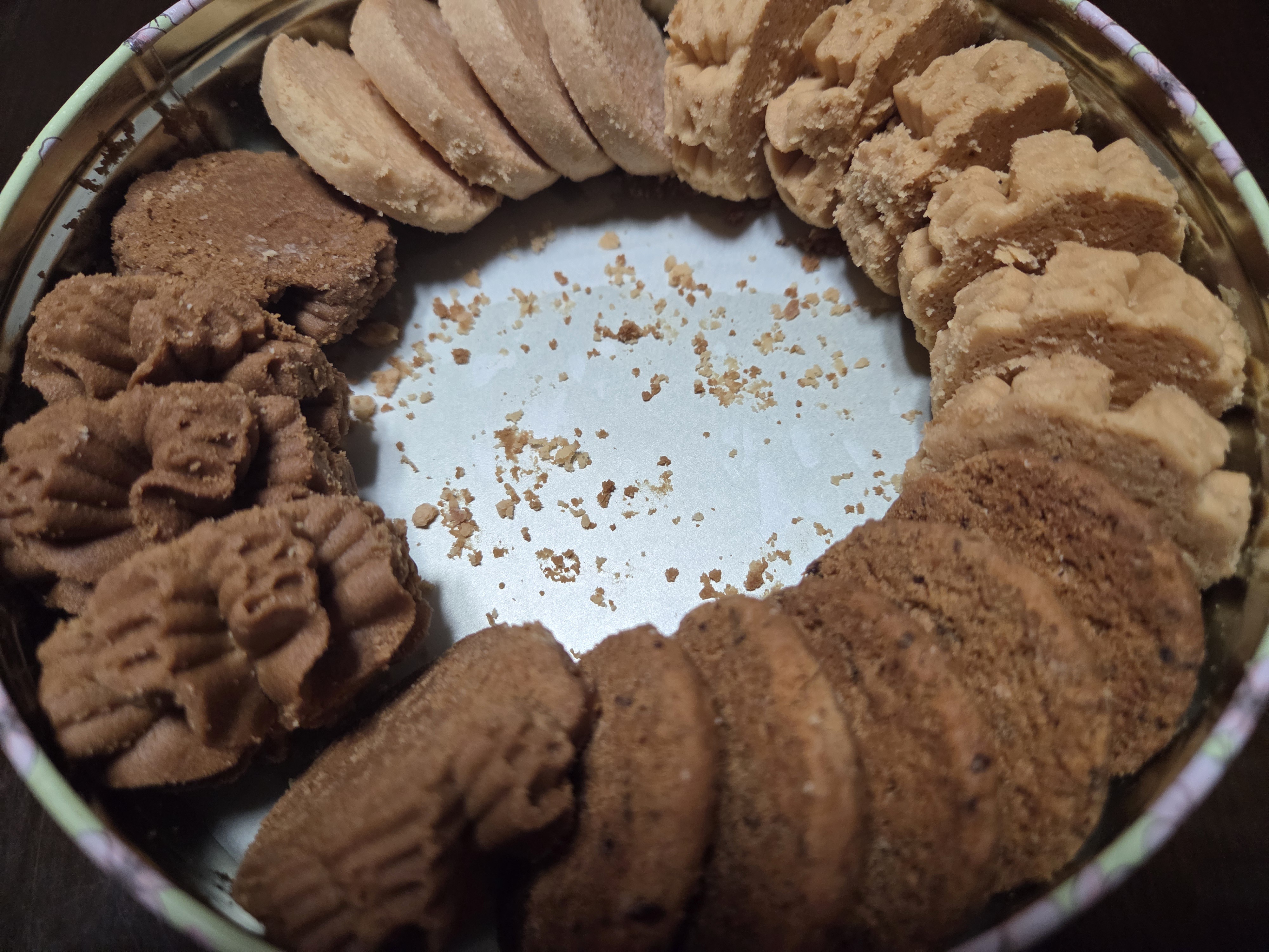 쿠키 틴을 열자마자 고소한 버터 향이 퍼지고, 가지런히 정리된 네 가지 쿠키가 눈을 사로잡습니다.